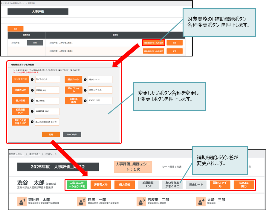 シートに表示される補助機能ボタンを、お客様にとって分かりやすい名称に変更できるようになりました。 ボタンの名称は業務単位で変更可能ですので、標準名称を貴社用にカスタマイズしてご利用いただけます。