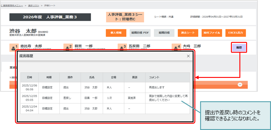 提出・承認・差戻しを行う際にコメントを入力できるようになりました。 入力したコメントは、各シートの「履歴」ボタンから承認履歴とあわせて確認できるようになっています。