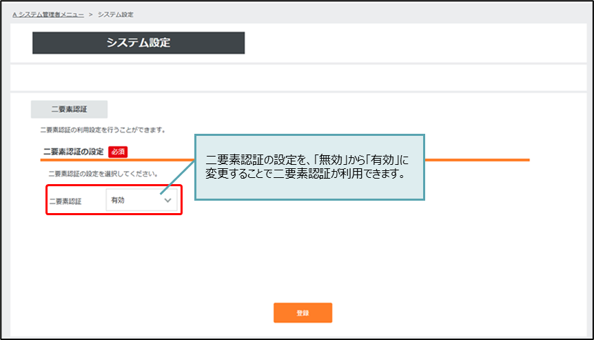 ① 二要素認証の利用有無をシステム全体で設定できるようになりました。