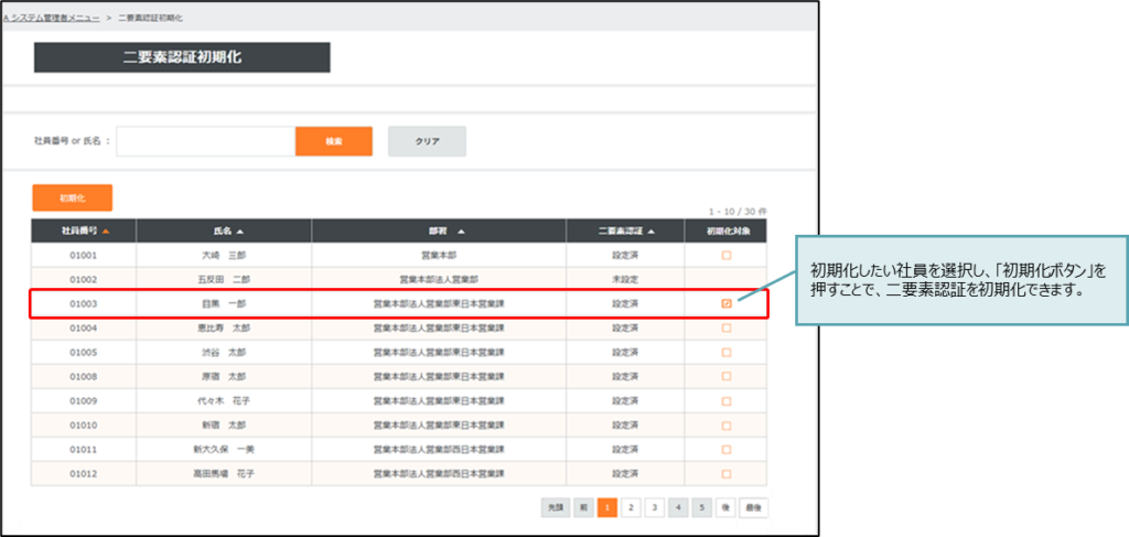 ② 利用者が二要素認証でログインできなくなった場合は、管理者が社員を選んで設定を初期化できます。